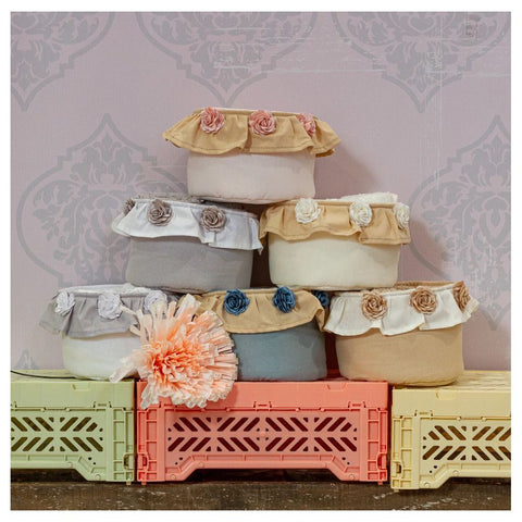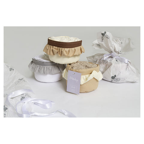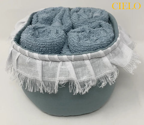 L'ATELIER 17 Cestino set quattro lavette bagno e ospiti in spugna con chignon in tulle, "CANDY" Shabby Chic 30x30 cm 4 varianti