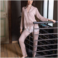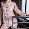 Un pigiama due pezzi raffinato, con collo sciallato e delicati inserti in pizzo bianco.