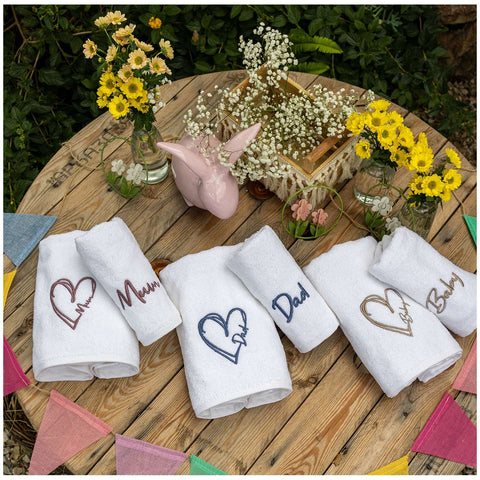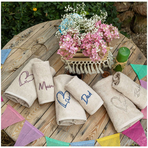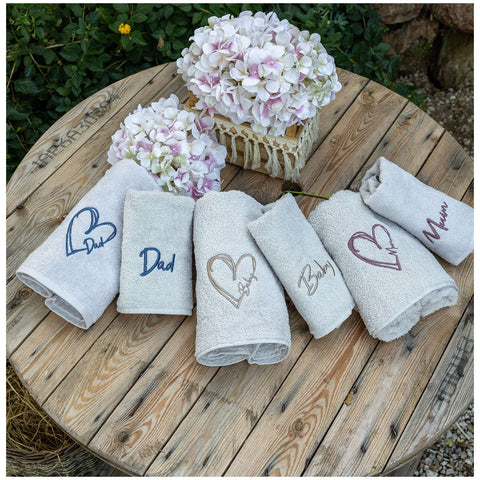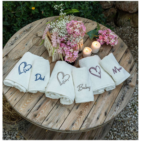 Meraviglioso set di 3+3 asciugamani con graziosi ricami: Mom(Mamma), Dad(Papà) e Baby(Bambino), realizzati interamente in spugna di cotone di alta qualità resistenti e durevoli nel tempo.